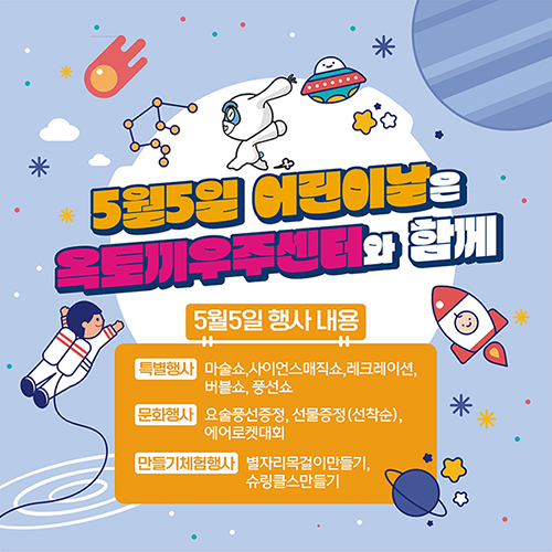 서울근교 어린이날 가볼만 한곳 - 옥토끼우주센터는 국내 최초의 항공우주과학 테마파크입니다. 항공우주 관련 자료를 수집, 보존하여 어린이 및 일반 대중들의 항공우주과학에 대한 이해를 돕기 위한 전시하고 있습니다. 다가오는 5월 5일 어린이날에는 마술쇼, 사이언스매직쇼, 레크레이션, 버블쇼, 풍선쇼 등을 진행하고 만들기 체험이나 풍선 등 선착순 선물도 증정 중이다.